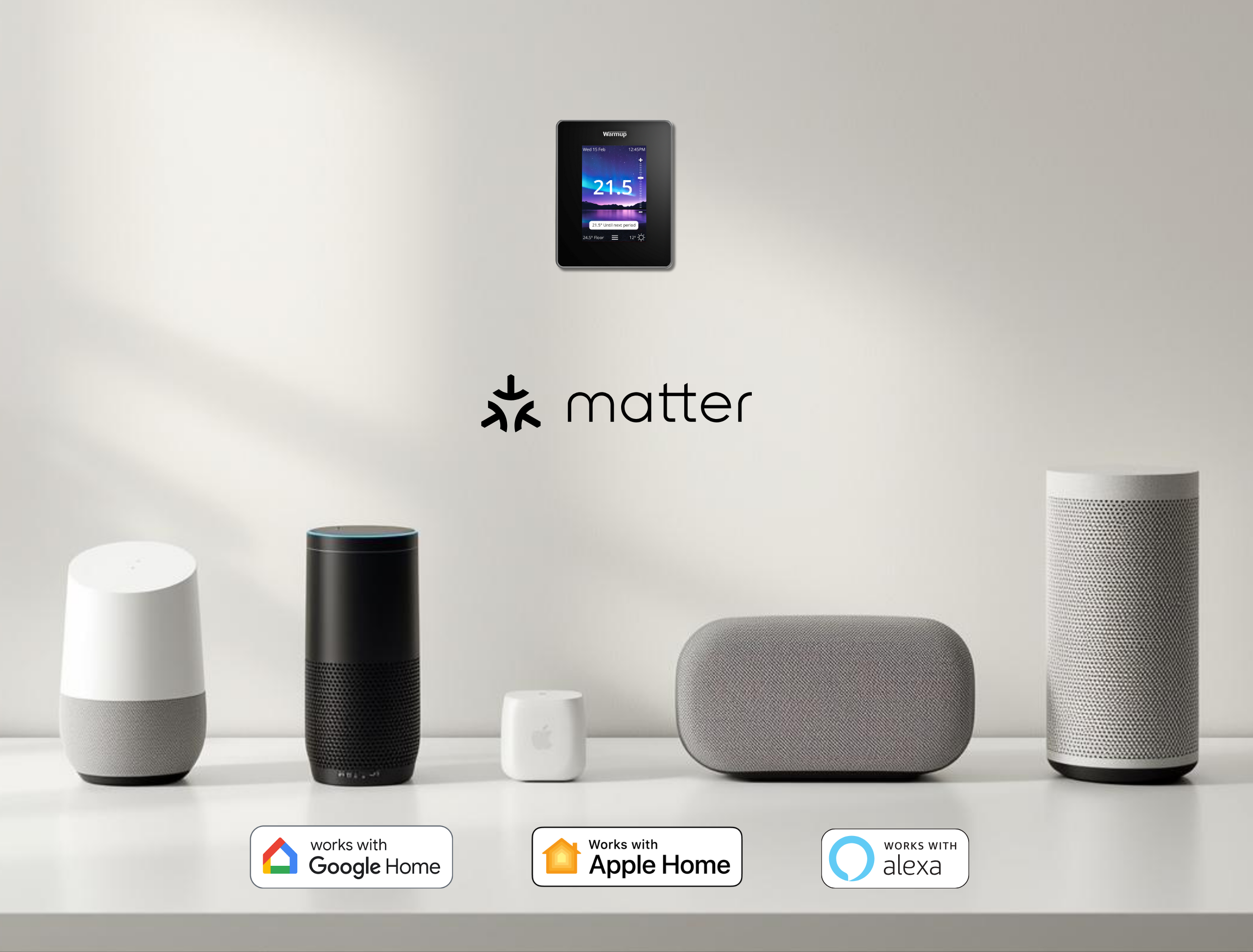 La avanzada tecnología Matter permite que el 7iE integre sistemas de calefacción en un entorno de hogar inteligente. El control es posible desde cualquier dispositivo compatible con Matter, incluyendo Apple Home, Google Home y Amazon Alexa. La calefacción puede gestionarse mediante comandos de voz o rutinas automatizadas desde una sola plataforma, ofreciendo una experiencia fluida.